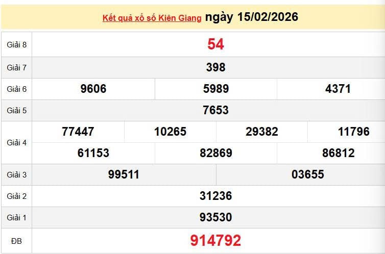 XSKG 15/2, KQXSKG 15/2. Xem lại kết quả xổ số Kiên Giang ngày 15/2/2026