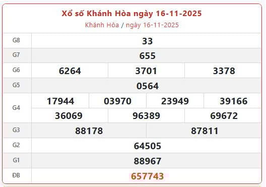 XSKH 16/11, KQXSKH 16/11. Xem lại kết quả xổ số Khánh Hòa ngày 16/11/2025