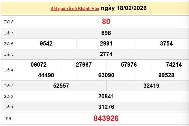 XSKH 18/2, KQXSKH 18/2. Xem lại kết quả xổ số Khánh Hòa ngày 18/2/2026