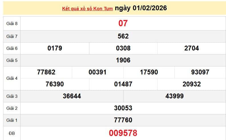 XSKT 1/2, KQXSKT 1/2. Xem lại kết quả xổ số Kon Tum ngày 1/2/2026
