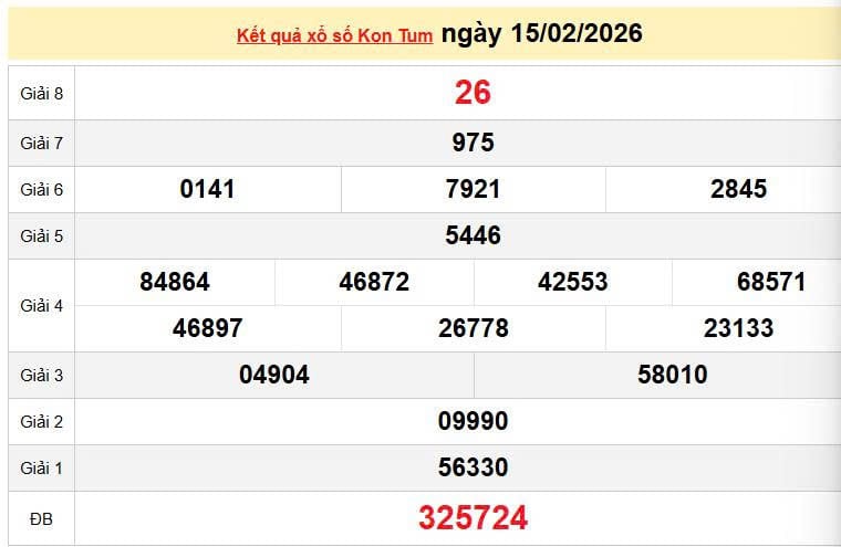 XSKT 15/2, KQXSKT 15/2. Xem lại kết quả xổ số Kon Tum ngày 15/2/2026