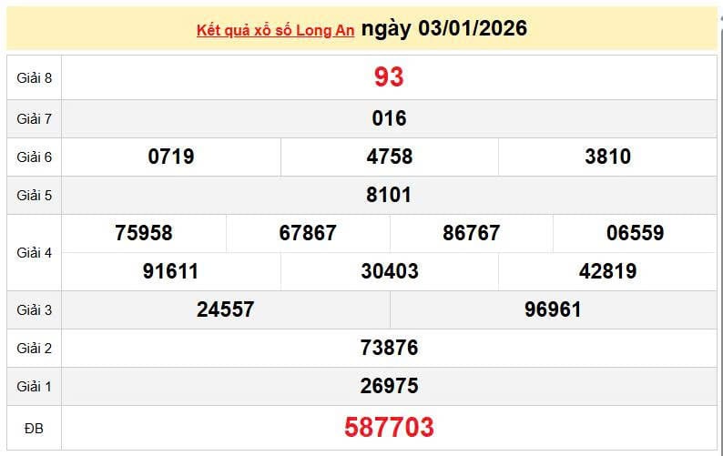 XSLA 3/1, KQXSLA 3/1. Xem lại kết quả xổ số Long An ngày 3/1/2026