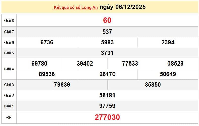 XSLA 6/12, KQXSLA 6/12. Xem lại kết quả xổ số Long An ngày 6/12/2025
