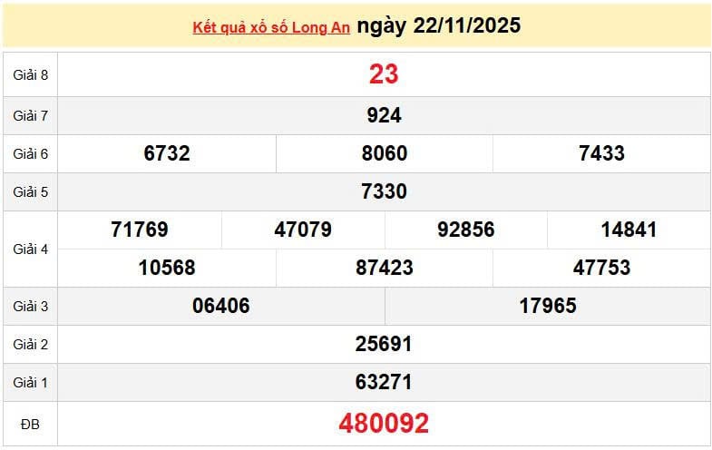 XSLA 22/11, KQXSLA 22/11. Xem lại kết quả xổ số Long An ngày 22/11/2025