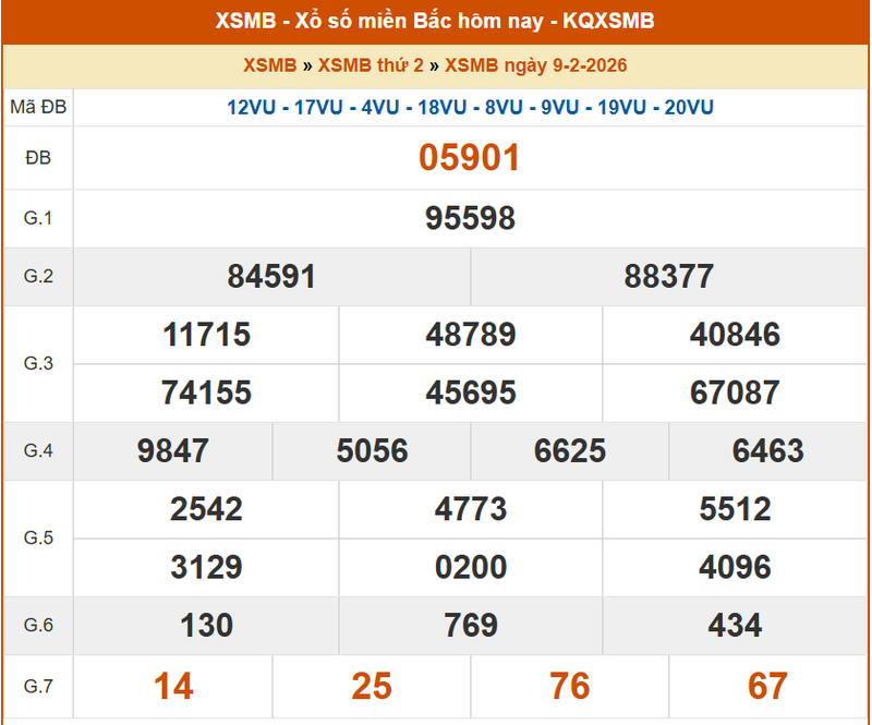 XSMB 9/2, KQXSMB 9/2. Xem lại kết quả xổ số miền Bắc ngày 9/2/2026