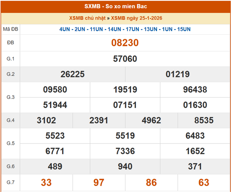 XSMB 25/1, KQXSMB 25/1. Xem lại kết quả xổ số miền Bắc ngày 25/1/2026
