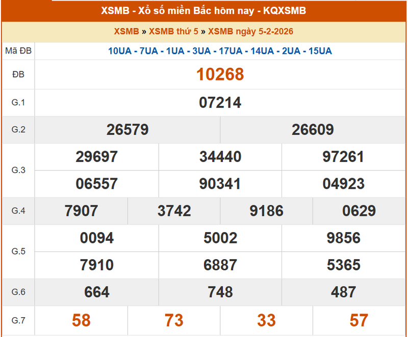 XSMB 5/2, KQXSMB 5/2. Xem lại kết quả xổ số miền Bắc ngày 5/2/2026