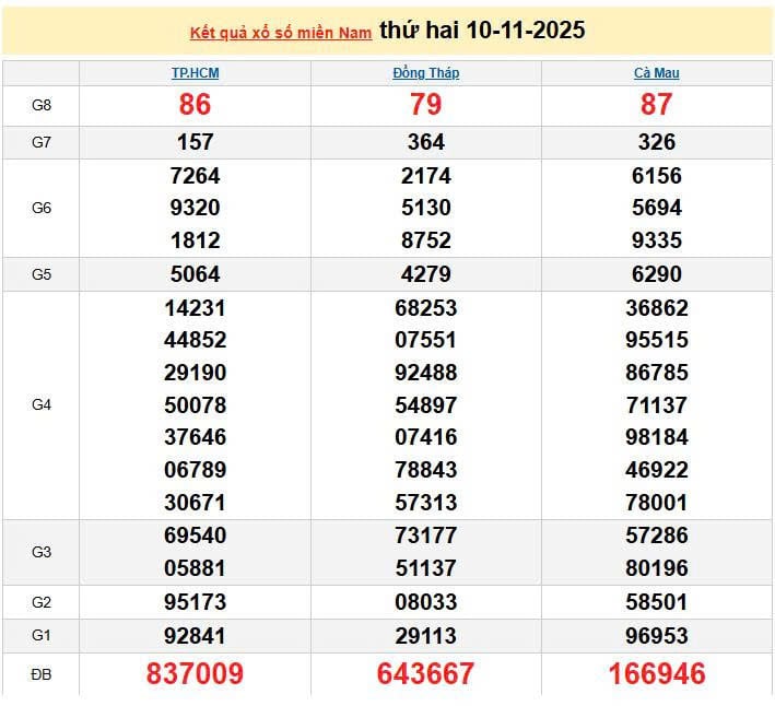 XSMN 10/11, KQXSMN 10/11. Xem lại kết quả xổ số miền Nam ngày 10/11/2025