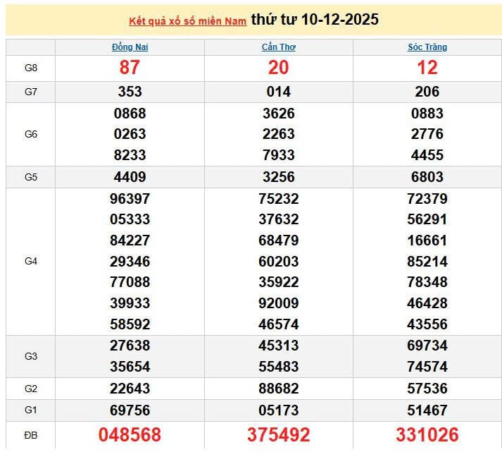 XSMN 10/12, KQXSMN 10/12. Xem lại kết quả xổ số miền Nam ngày 10/12/2025