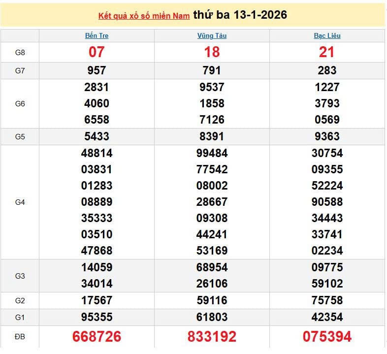 XSMN 13/1, KQXSMN 13/1. Xem lại kết quả xổ số miền Nam ngày 13/1/2026