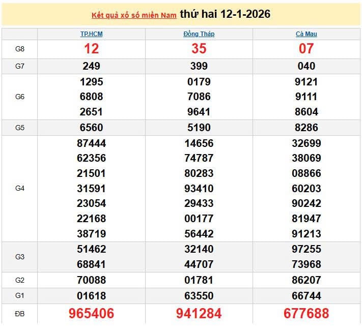 XSMN 12/1, KQXSMN 12/1. Xem lại kết quả xổ số miền Nam ngày 12/1/2026
