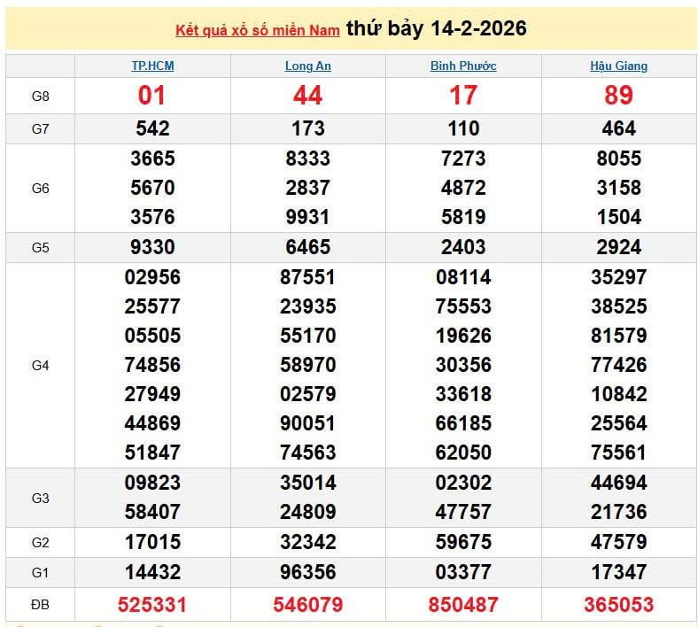 XSMN 14/2, KQXSMN 14/2. Xem lại kết quả xổ số miền Nam ngày 14/2/2026