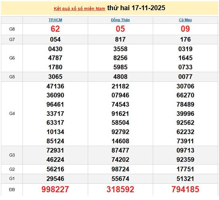 XSMN 17/11, KQXSMN 17/11. Xem lại kết quả xổ số miền Nam ngày 17/11/2025
