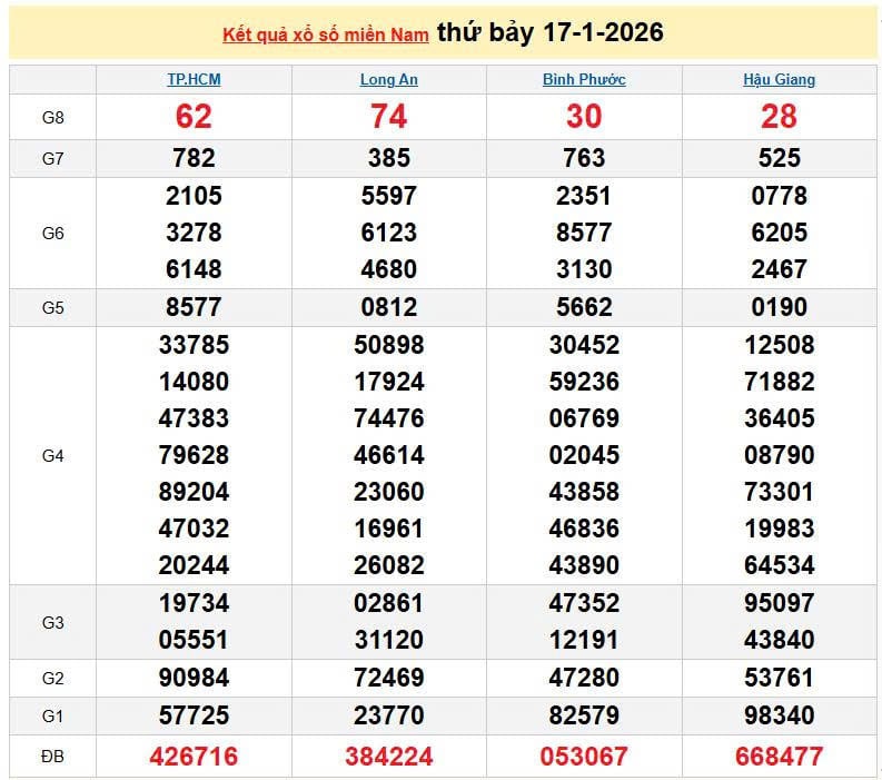 XSMN 17/1, KQXSMN 17/1. Xem lại kết quả xổ số miền Nam ngày 17/1/2026