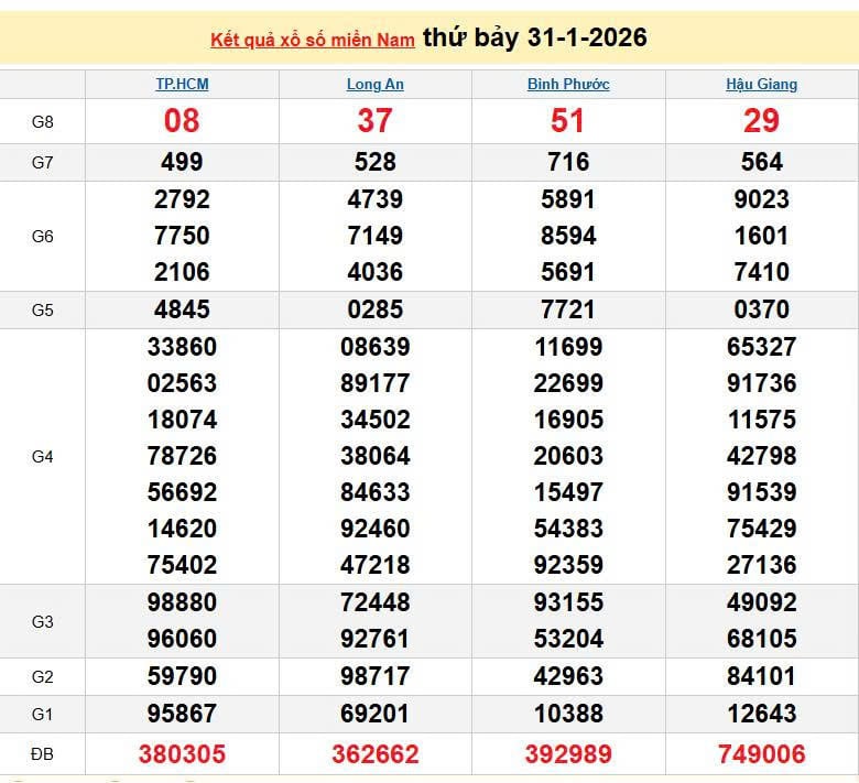 XSMN 31/1, KQXSMN 31/1. Xem lại kết quả xổ số miền Nam ngày 31/1/2026
