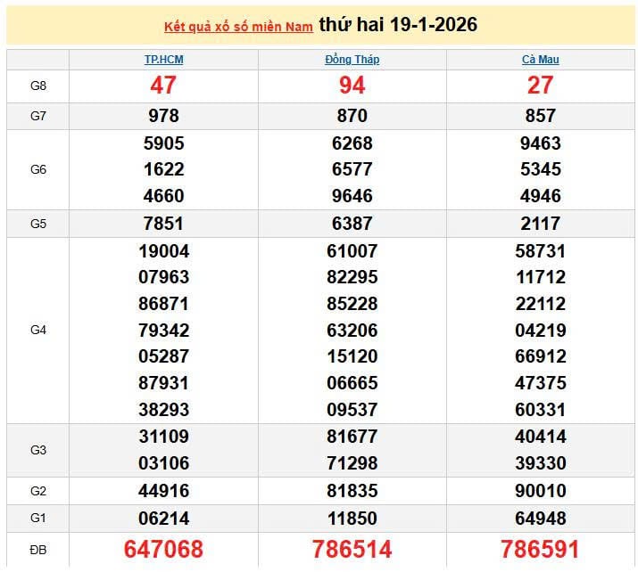 XSMN 19/1, KQXSMN 19/1. Xem lại kết quả xổ số miền Nam ngày 19/1/2026