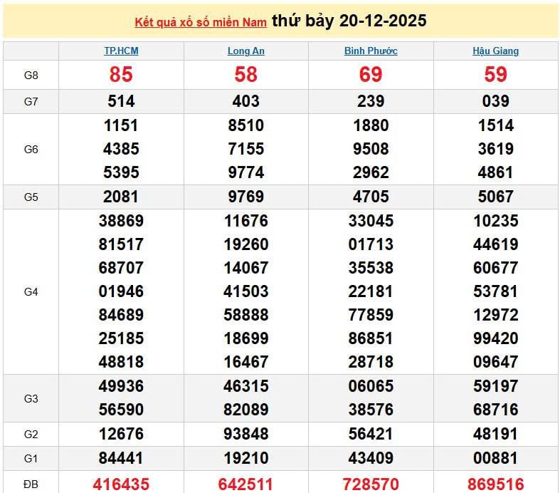 XSMN 20/12, KQXSMN 20/12. Xem lại kết quả xổ số miền Nam ngày 20/12/2025