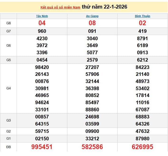 XSMN 22/1, KQXSMN 22/1. Xem lại kết quả xổ số miền Nam ngày 22/1/2026