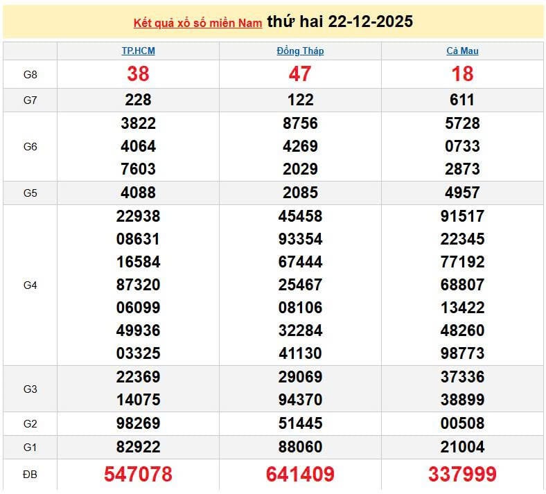 XSMN 22/12, KQXSMN 22/12. Xem lại kết quả xổ số miền Nam ngày 22/12/2025