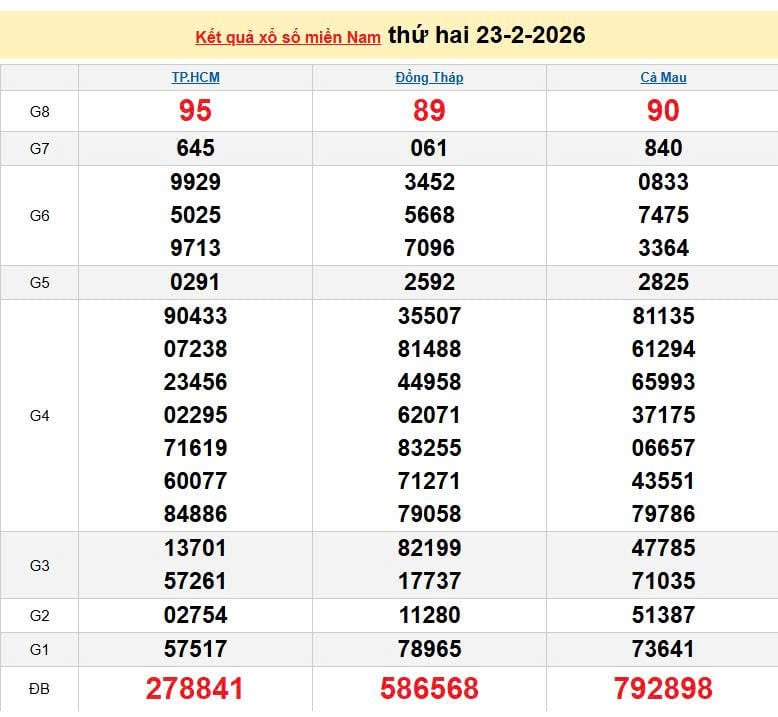 XSMN 23/2, KQXSMN 23/2. Xem lại kết quả xổ số miền Nam ngày 23/2/2026