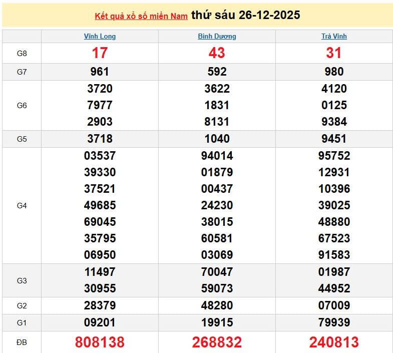 XSMN 26/12, KQXSMN 26/12. Xem lại kết quả xổ số miền Nam ngày 26/12/2025