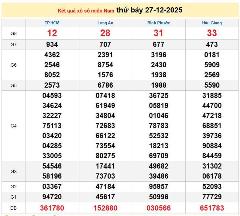 XSMN 27/12, KQXSMN 27/12. Xem lại kết quả xổ số miền Nam ngày 27/12/2025