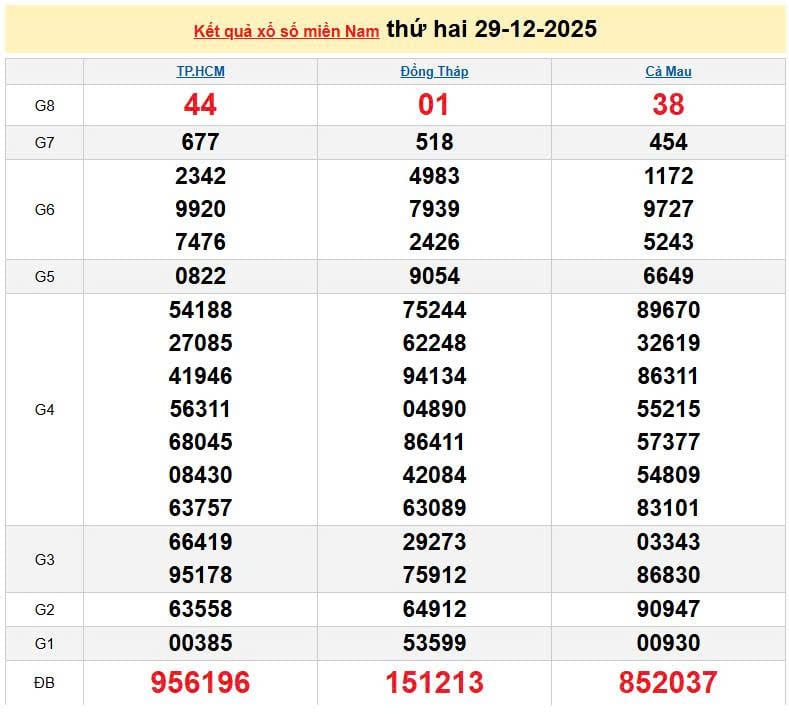 XSMN 29/12, KQXSMN 29/12. Xem lại kết quả xổ số miền Nam ngày 29/12/2025