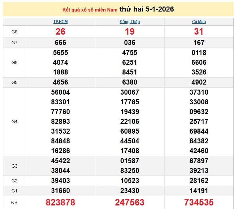 XSMN 5/1, KQXSMN 5/1. Xem lại kết quả xổ số miền Nam ngày 5/1/2026