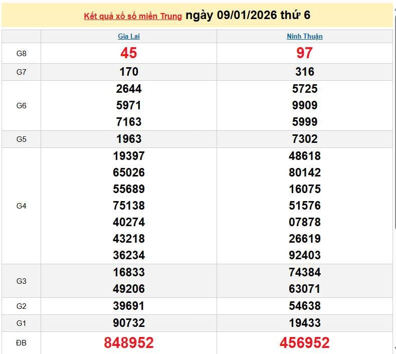 XSMT 9/1, KQXSMT 9/1. Xem lại kết quả xổ số miền Trung ngày 9/1/2026