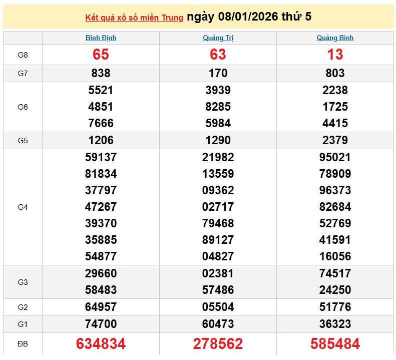 XSMT 8/1, KQXSMT 8/1. Xem lại kết quả xổ số miền Trung ngày 8/1/2026