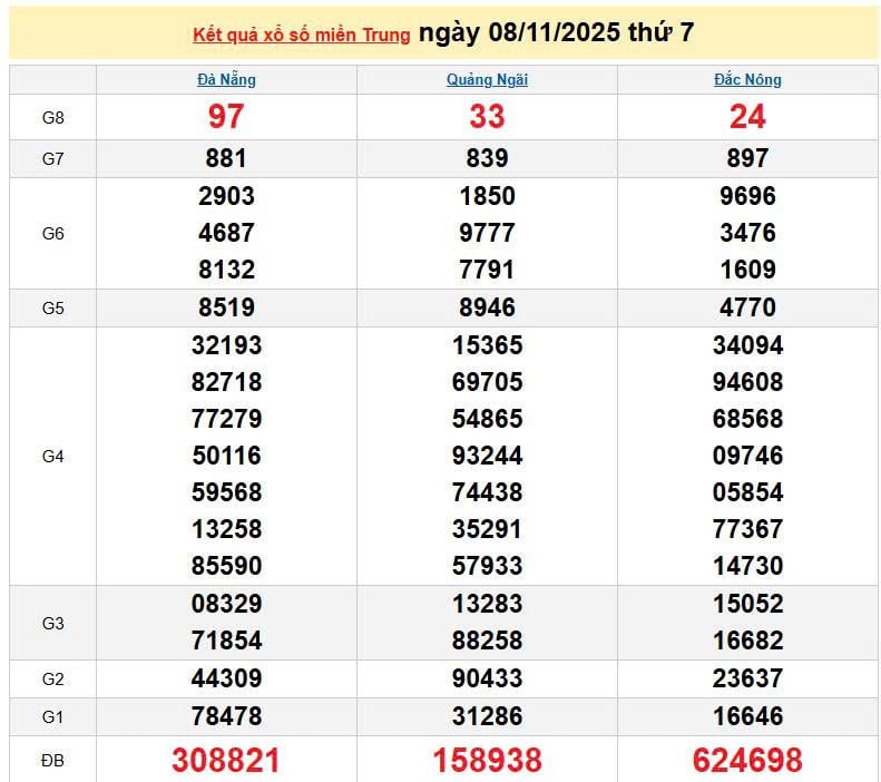 XSMT 8/11, KQXSMT 8/11. Xem lại kết quả xổ số miền Trung ngày 8/11/2025