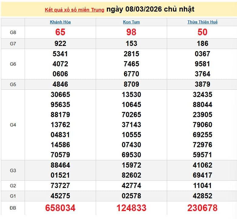 XSMT 8/3, KQXSMT 8/3. Xem lại kết quả xổ số miền Trung ngày 8/3/2026