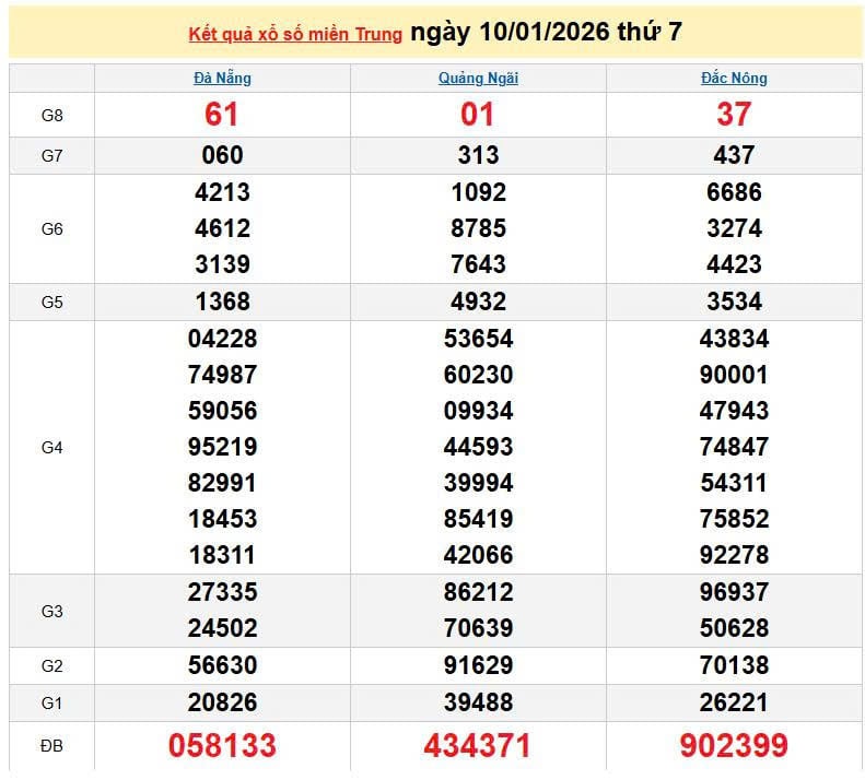 XSMT 10/1, KQXSMT 10/1. Xem lại kết quả xổ số miền Trung ngày 10/1/2026