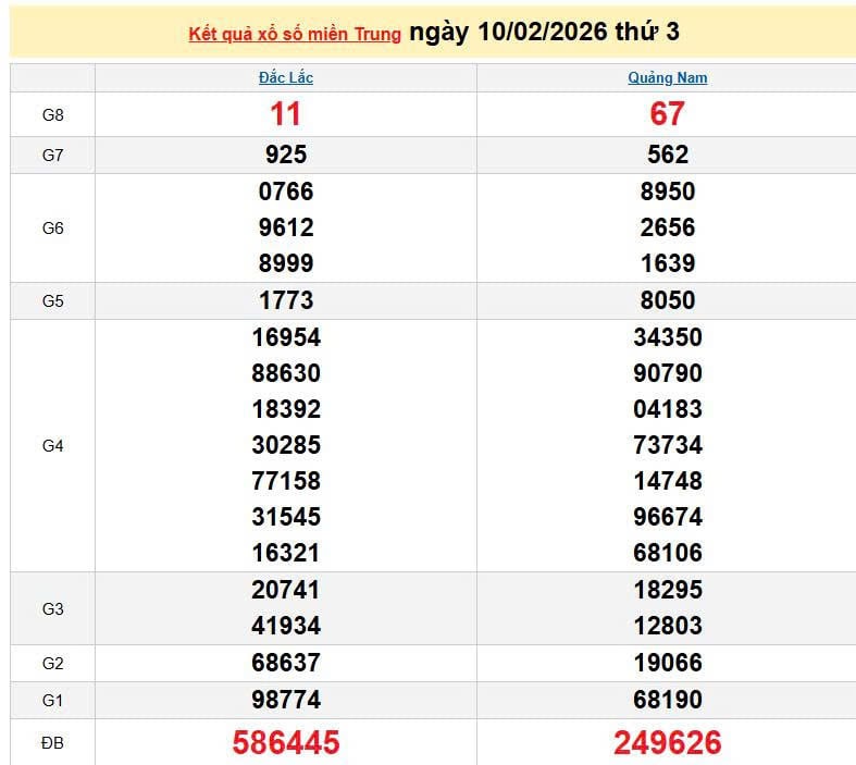 XSMT 10/2, KQXSMT 10/2. Xem lại kết quả xổ số miền Trung ngày 10/2/2026