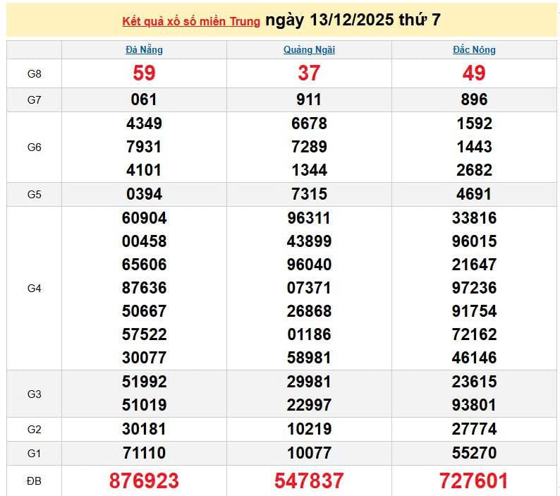 XSMT 13/12, KQXSMT 13/12. Xem lại kết quả xổ số miền Trung ngày 13/12/2025
