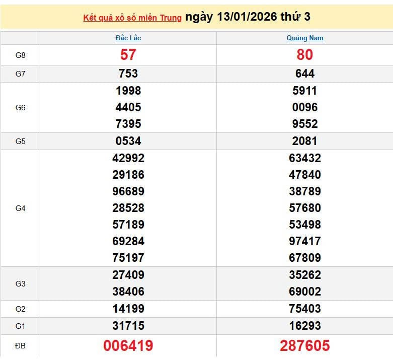 XSMT 13/1, KQXSMT 13/1. Xem lại kết quả xổ số miền Trung ngày 13/1/2026