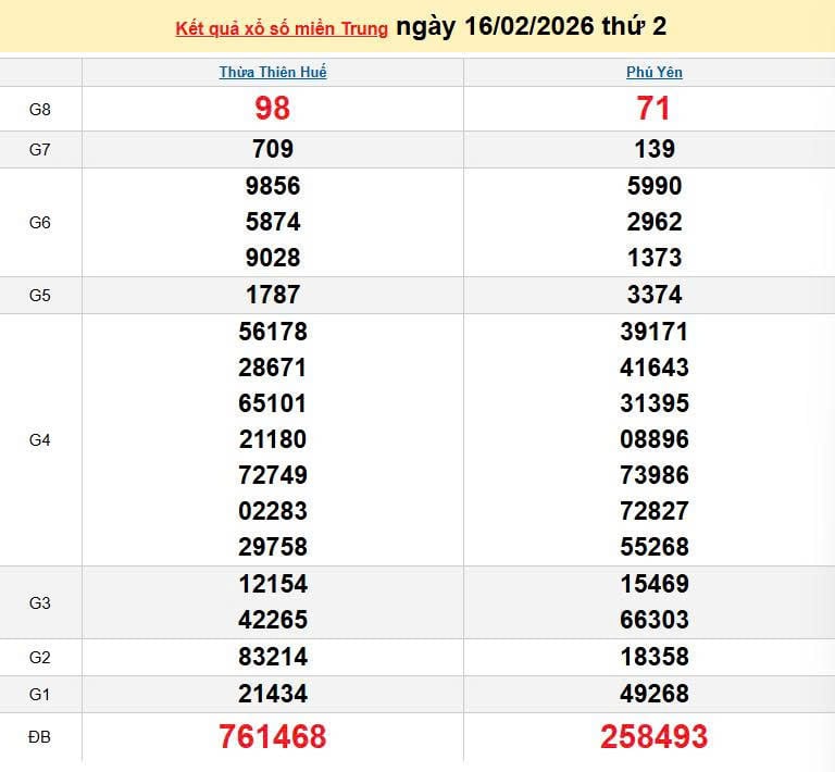 XSMT 16/2, KQXSMT 16/2. Xem lại kết quả xổ số miền Trung ngày 16/2/2026