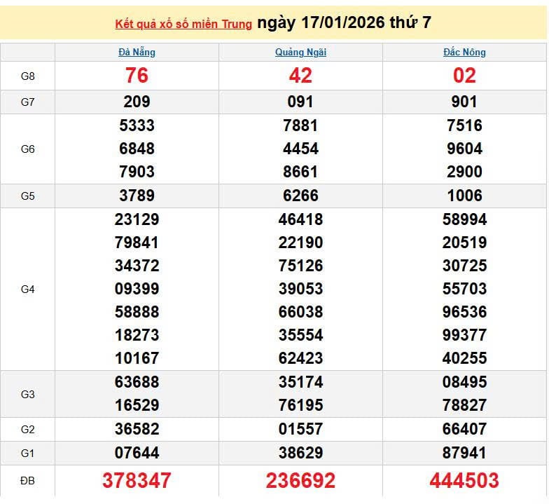 XSMT 17/1, KQXSMT 17/1. Xem lại kết quả xổ số miền Trung ngày 17/1/2026