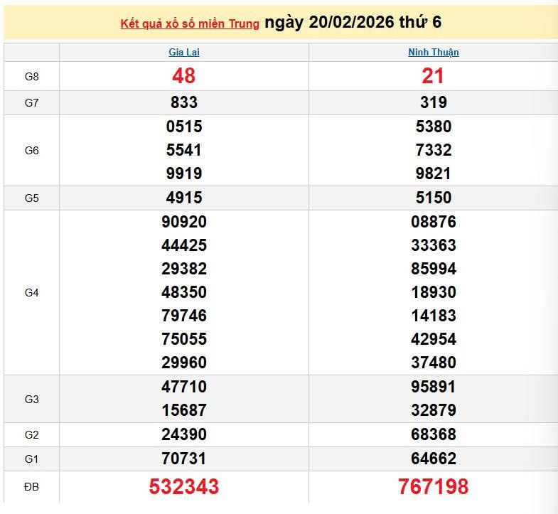 XSMT 20/2, KQXSMT 20/2. Xem lại kết quả xổ số miền Trung ngày 20/2/2026