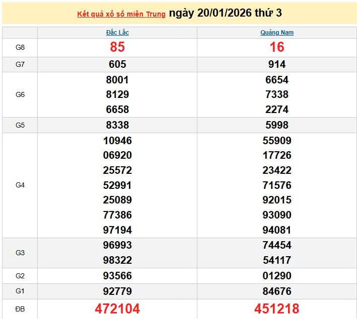 XSMT 20/1, KQXSMT 20/1. Xem lại kết quả xổ số miền Trung ngày 20/1/2026
