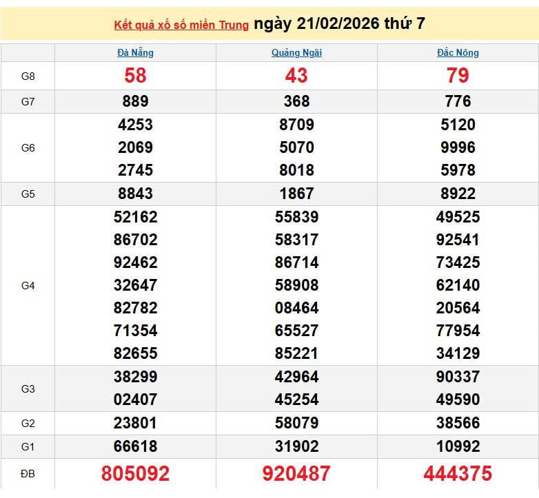 XSMT 21/2, KQXSMT 21/2. Xem lại kết quả xổ số miền Trung ngày 21/2/2026