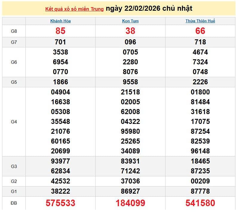 XSMT 22/2, KQXSMT 22/2. Xem lại kết quả xổ số miền Trung ngày 22/2/2026