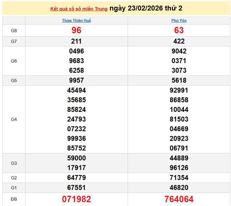 XSMT 23/2, KQXSMT 23/2. Xem lại kết quả xổ số miền Trung ngày 23/2/2026