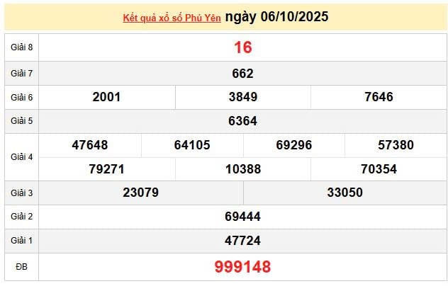 XSPY 6/10, KQXSPY 6/10. Xem lại kết quả xổ số Phú Yên ngày 6/10/2025