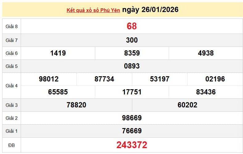 XSPY 26/1, KQXSPY 26/1. Xem lại kết quả xổ số Phú Yên ngày 26/1/2026