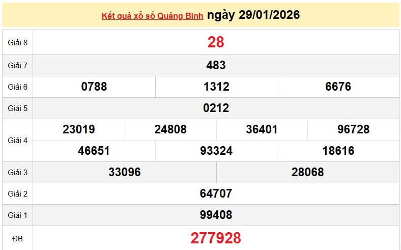 XSQB 29/1, KQXSQB 29/1. Xem lại kết quả xổ số Quảng Bình ngày 29/1/2026