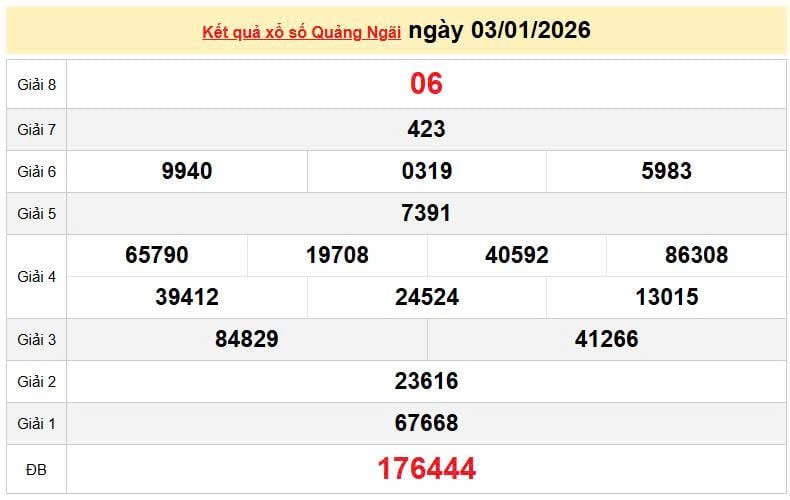 XSQNG 3/1, KQXSQNG 3/1. Xem lại kết quả xổ số Quảng Ngãi ngày 3/1/2026