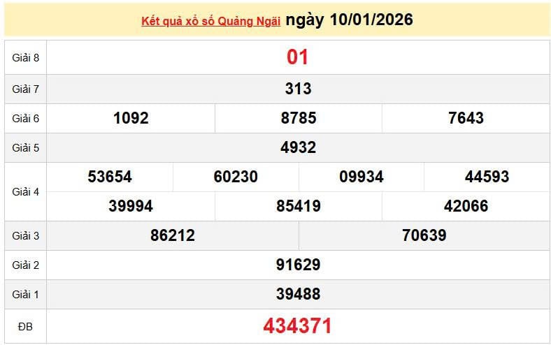 XSQNG 10/1, KQXSQNG 10/1. Xem lại kết quả xổ số Quảng Ngãi ngày 10/1/2026
