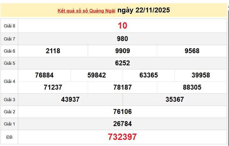 XSQNG 22/11, KQXSQNG 22/11. Xem lại kết quả xổ số Quảng Ngãi ngày 22/11/2025