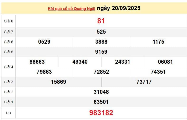 XSQNG 20/9, KQXSQNG 20/9. Xem lại kết quả xổ số Quảng Ngãi ngày 20/9/2025